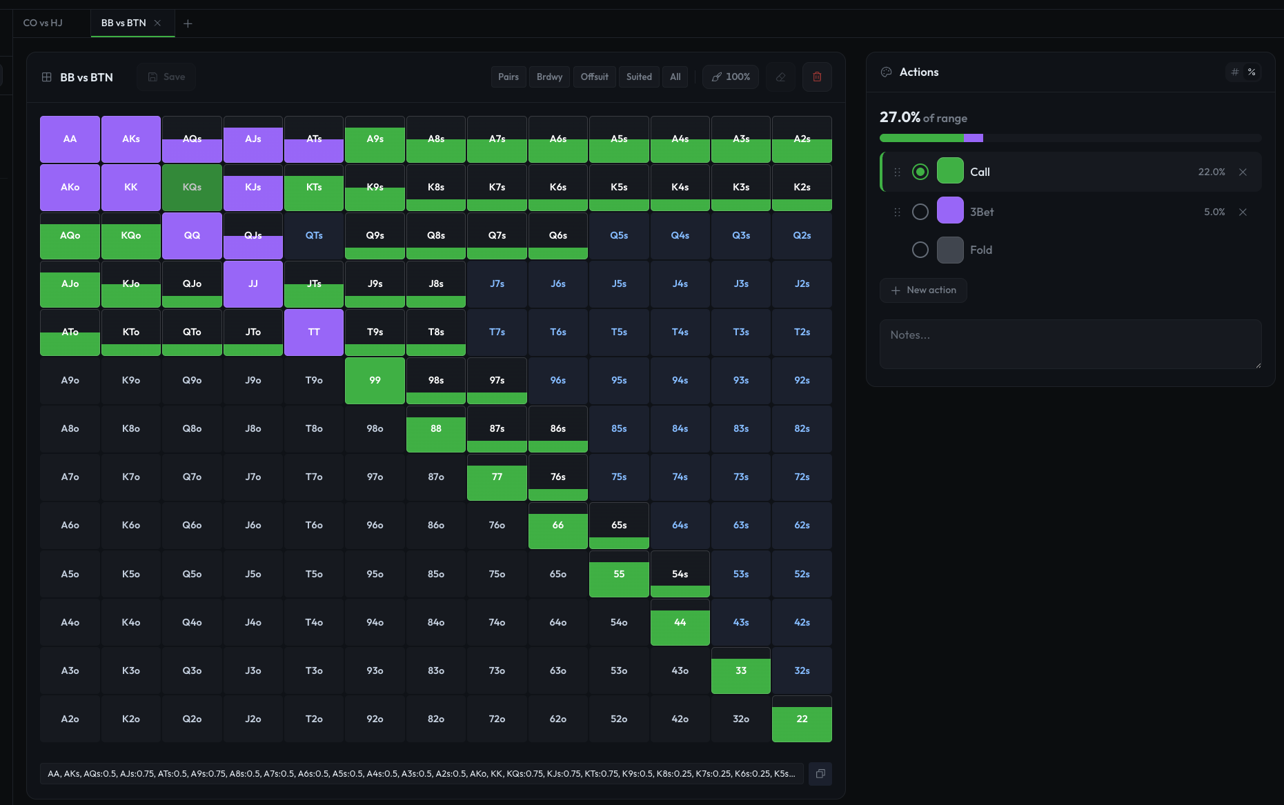 Créez vos ranges à la main ou importez-les depuis vos solvers. Actions, pondérations et notes en un clin d'œil.
